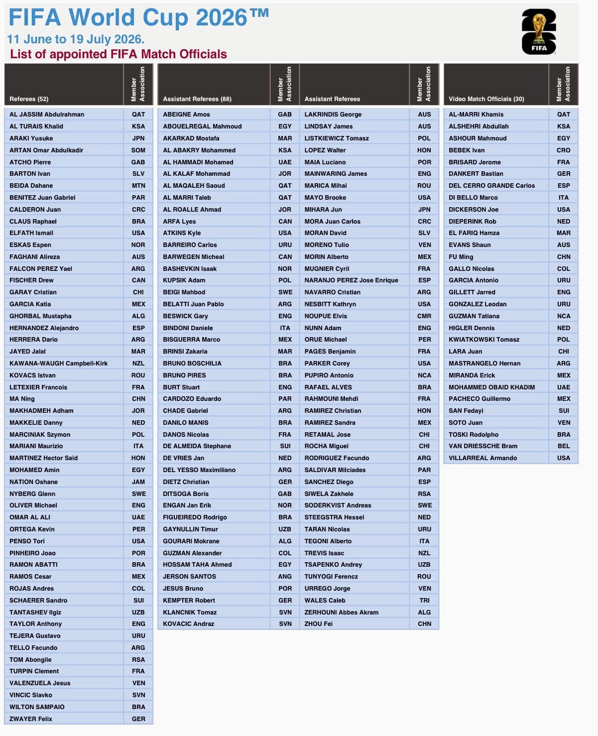 The list of African referees selected for the 2026 FIFA World Cup is now official. A total of 19 match officials from the continent will represent Africa at the tournament scheduled for June 2026. The breakdown is as follows: 7 central referees, 10 assistant referees, and 2 VAR officials.